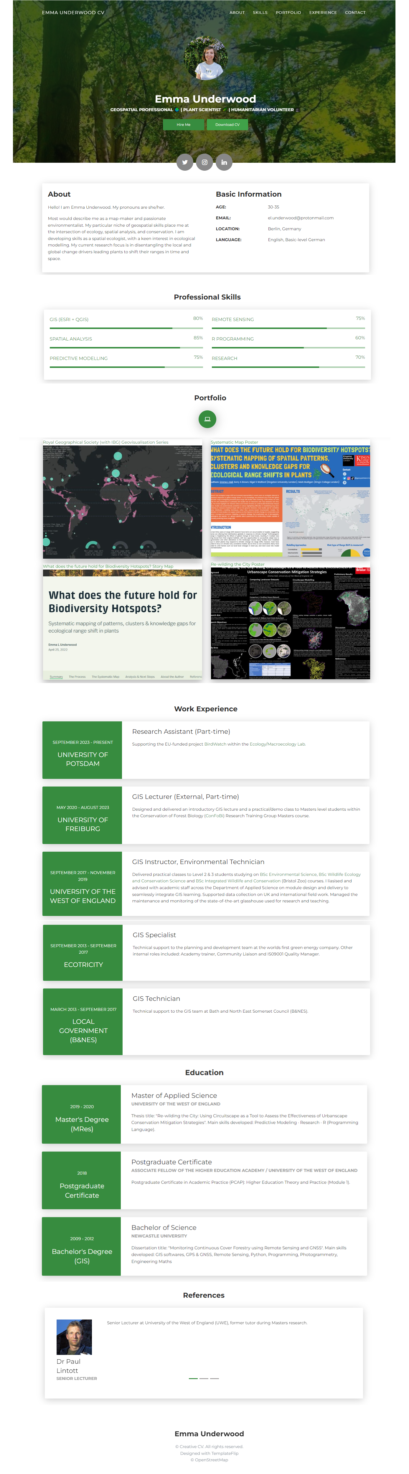 Most would describe me as a map-maker and passionate, intersectional environmentalist. My particular niche of geospatial skills place me at the intersection of ecology, spatial analysis, and conservation. Beyond core GIS, I have developed skills as a spatial ecologist, with a keen interest in ecological modelling. My most recent research focused on disentangling the local and global change drivers leading plants to shift their ranges in time and space.